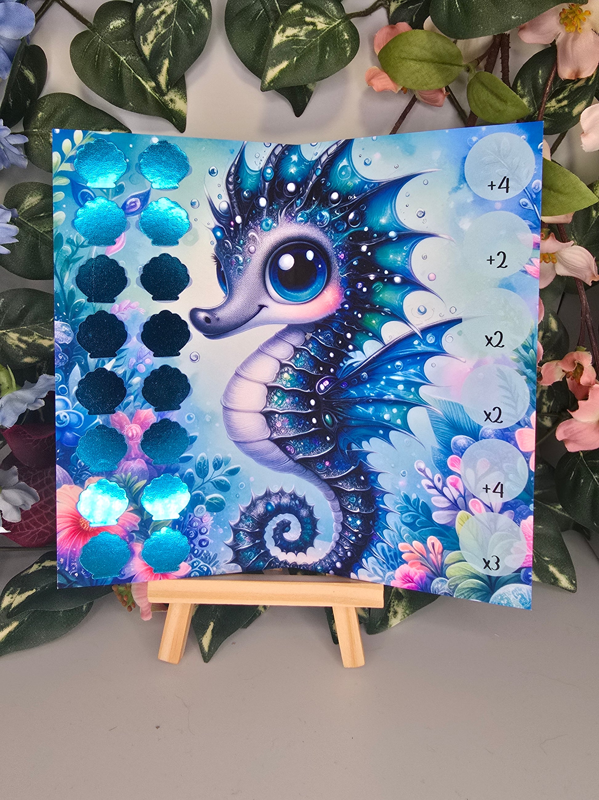Die Klappkarte kommt mit Rubbelfeldern und etwas zum Würfeln zu dir. Würfle mit einem Würfel deiner Wahl. Entscheide dich für einen Kreis und rechne deine erwürfelte Zahl mit dem Multiplikator zusammen.