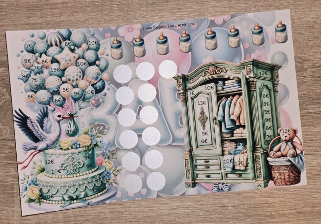Du erwartest ein Baby oder planst schwanger zu werden? Dann kannst du mit dieser süßen 3er Klappkarte genau dafür sparen. Die Klappkarte kannst du für einen Jungen und einem Mädchen benutzen. Die Klappkarte hat ganz viele Beträge zum Abstreichen, Rubbelfelder und du bekommst Lose dazu.